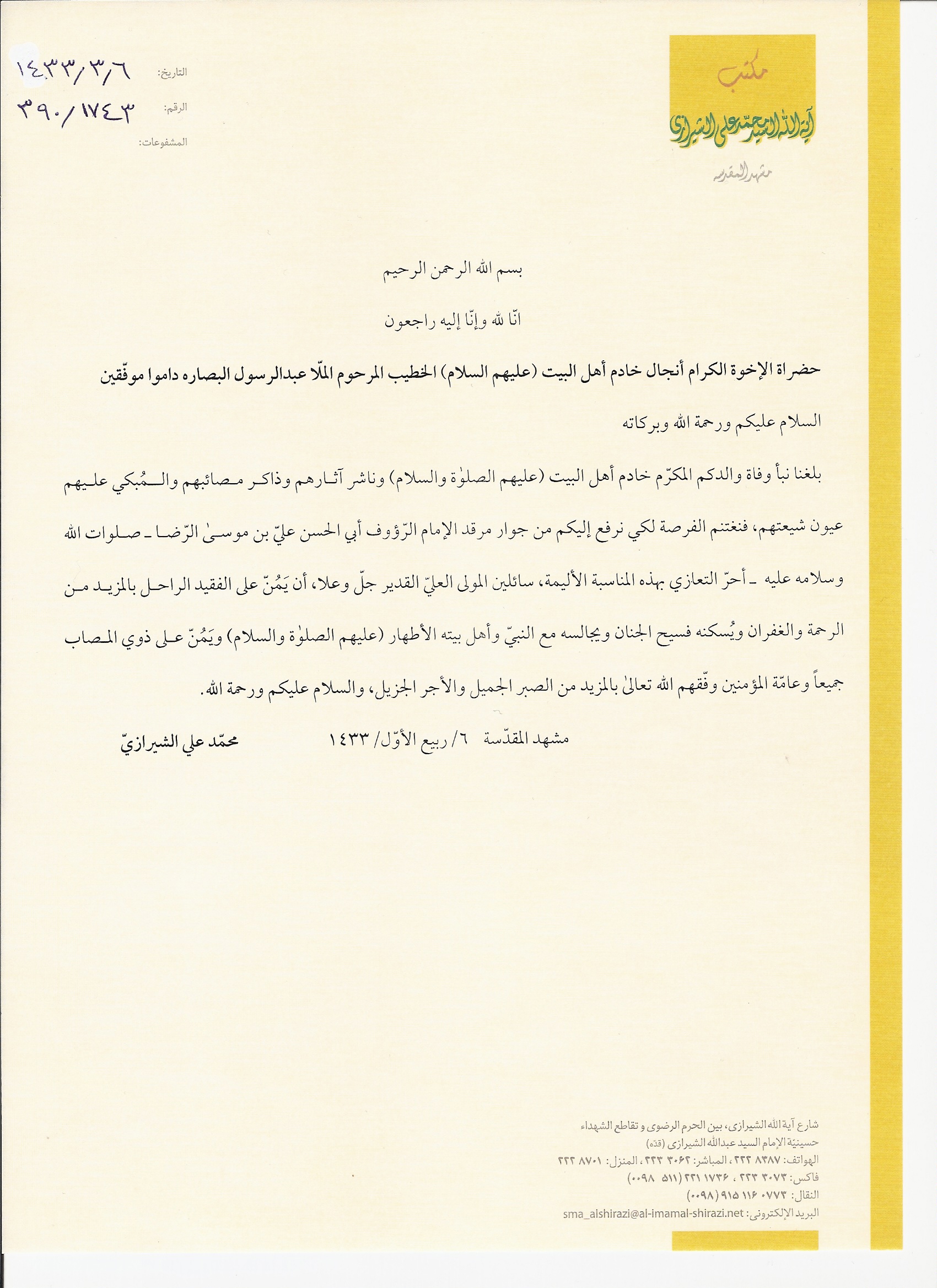 تعزية من مكتب آية الله السيد محمد علي الشيرازي