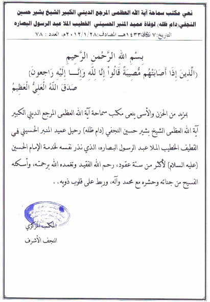 تعزية من مكتب آية الله العظمى الشيخ بشير النجفي دام ظله